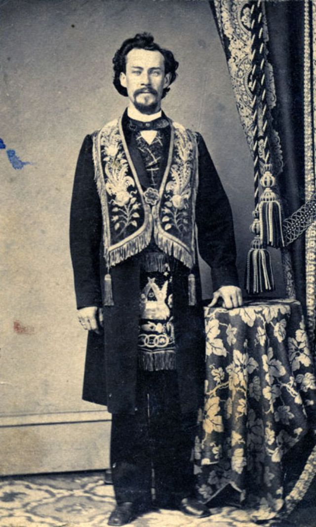 A bearded man stands before the camera operator wearing the embroidered accouterments that signal his membership in the Masons