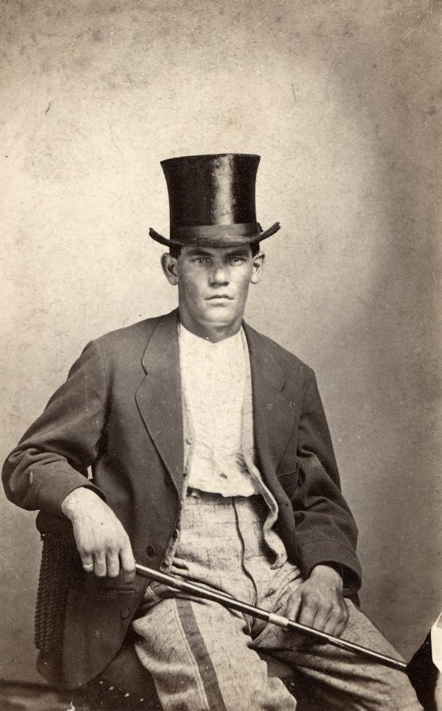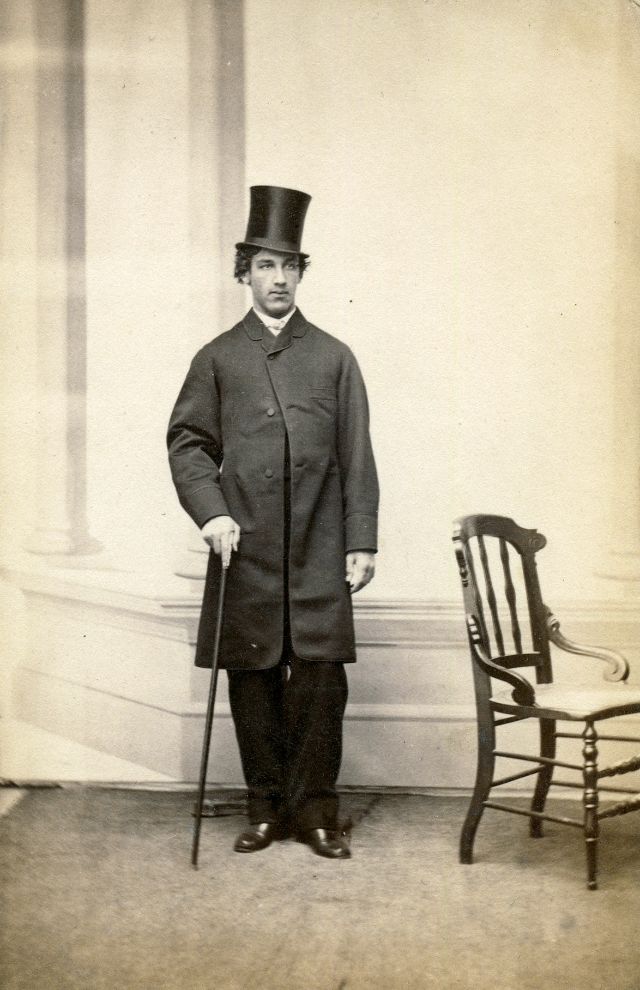 A Maine gentleman strikes a casual pose with frock coat, top hat and cane