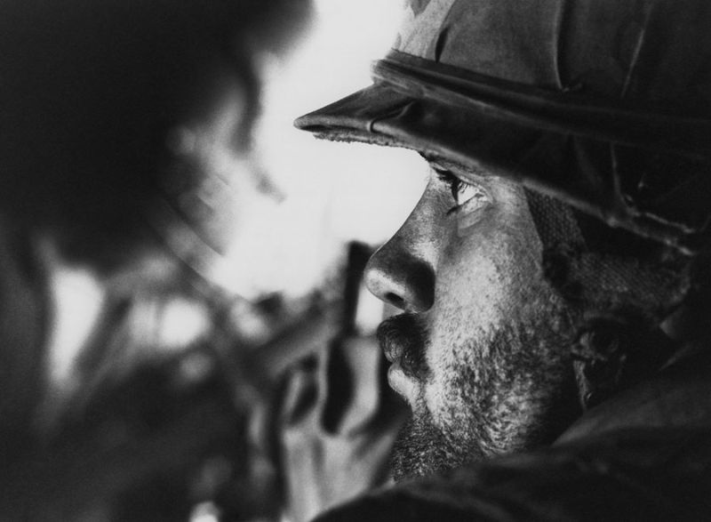 A U.S Marine with several days of beard growth sits in a helicopter on July 18, 1968, after being picked up from a landing zone near Con Thein on the southern edge of the demilitarized zone in South Vietnam. His unit had just been relieved of duty after patrolling the region around the DMZ.
