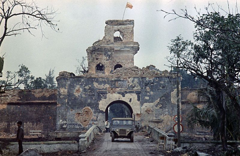 The flag of South Vietnam flies atop a tower of the main fortified structure in the old citadel as a jeep crosses a bridge over a moat in Hue during the Tet Offensive in February of 1968.