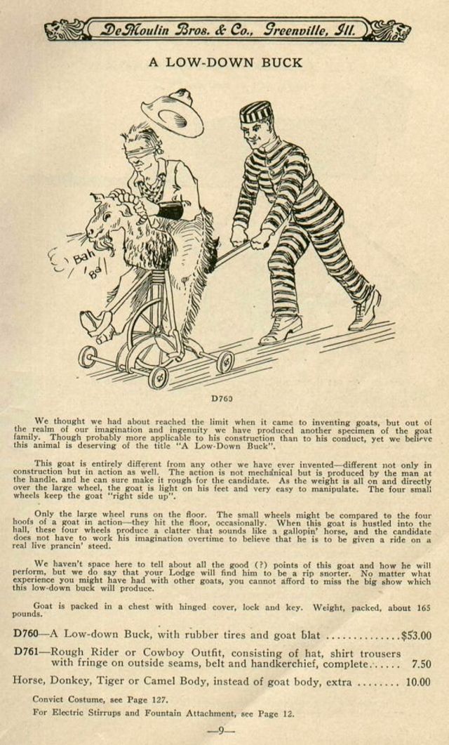 The DeMoulin’s odd business of fraternal machinery began in the late 1800s when Ed DeMoulin began working with his men’s group, the Modern Woodsmen of America, to begin crafting goats that new members would have to ride as part of their initiation. Ed had previously patented a hilarious “trick camera” that would squirt water at the unknowing subject, so his move into the prank goat industry was a natural fit. The company’s popularity soon grew and other fraternal orders such as the Odd Fellows began looking to the “goat factory” for their goofy initiation needs. Soon the DeMoulins were making spanking machines, lung tester gags, and of course, their rocking goats.