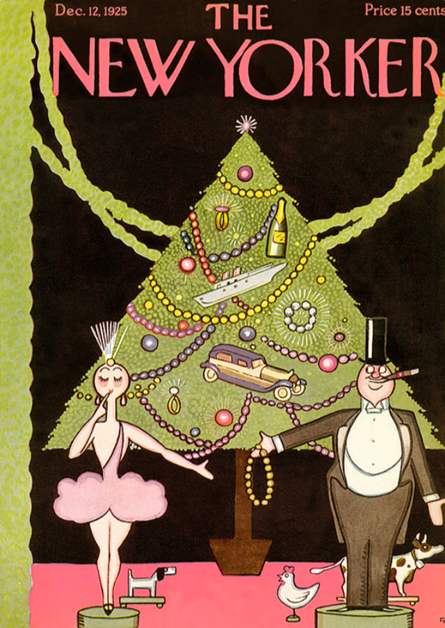 In the 1920s and 1930s, their Christmas covers primarily featured traditional, often whimsical, illustrations that captured classic holiday scenes and the bustle of New York City life. The style of the era, including elements of Art Deco, was prominent, and artists like Rea Irvin, Helen E. Hokinson, and Ilonka Karasz were frequent contributors.