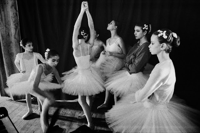 | Russian ballerinas ready themselves backstage before their stage appearance. |