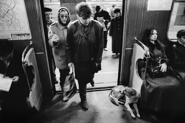| Subway passengers negotiate stray dogs while boarding trains in Moscow. |