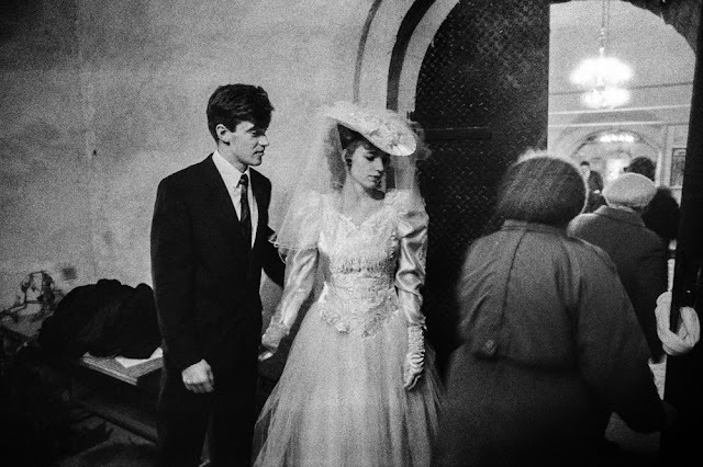 | A Russian bride on her way to her husband in a typical outdoor setting for many middle-class Russians. |