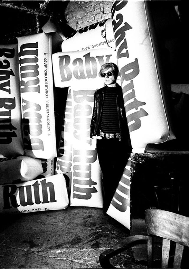 Andy Warhol with giant Baby Ruth bars, 1966