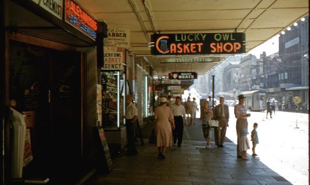 Lucky Owl Casket Shop (lottery agency) at 160 Adelaide Street, Brisbane, Australia, circa 1960
