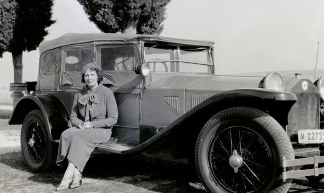 An elegant lady posing on the running board of a two-tone Lancia in the countryside, circa 1930