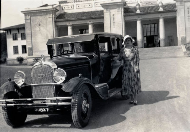 A middle-aged lady posing with a Citroën C6 in front of an impressive piece of Art nouveau architecture, possibly a spa building or sanatorium, circa 1930