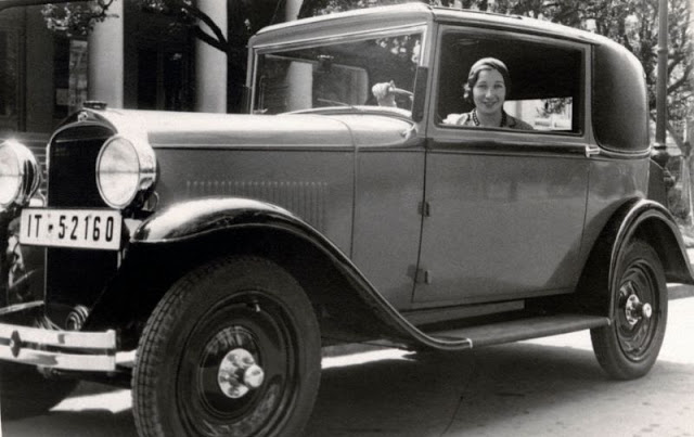 A cheerful lady posing in the driver’s seat of a fashionable two-tone Opel 1,8 Liter Sonnen-Coupé, circa 1931