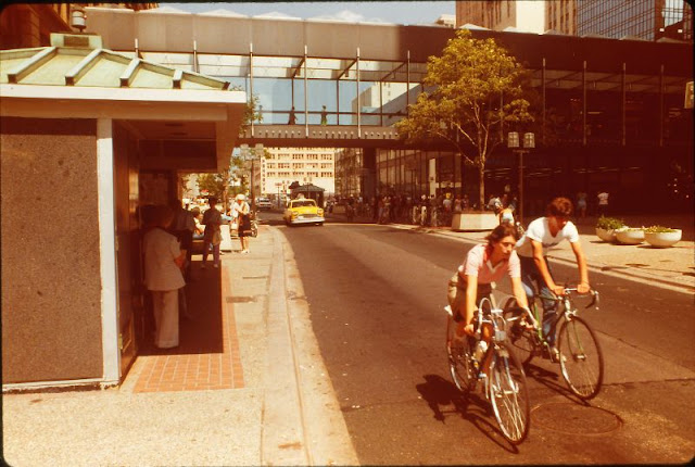 Biking along Nicollet Mall, Downtown Minneapolis, spring 1983
