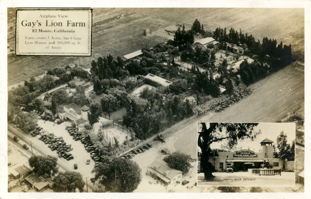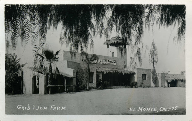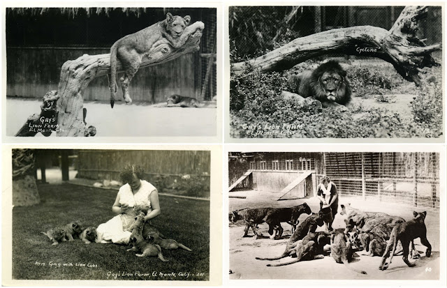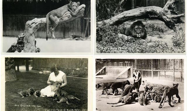 Gay’s Lion Farm was in El Monte, California, which is about 13 miles from Los Angeles. The farm opened in 1919 and closed in 1942. At one time the “farm” housed the MGM lion and several lions that were used in Tarzan movies. The site was open to tourists and they sold post cards, as you can see from the collection here. The following old postcards, brochures and other images of Gay’s Lion Farm, provide a great visual look back at Gay’s Lion Farm’s history.