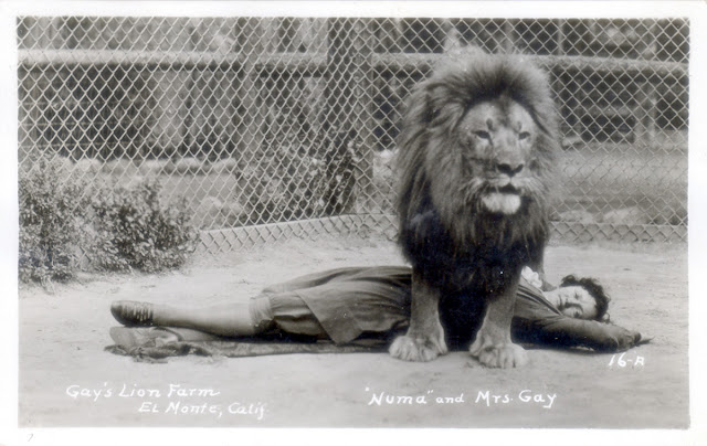 Needing more room for their animals, the Gays found a large plot of un-zoned property in El Monte, east of Los Angeles, where in 1925 they opened Gay’s Lion Farm, a public attraction dedicated to the breeding, training and exhibition of African lions. The Farm quickly became one of the most popular tourist attractions in the Southland, doing a brisk trade in souvenir photographic postcards. Among the famous animals raised on the Farm were Metro-Goldwyn-Mayer Studio lions Slats (1924–1927, died of appendicitis and was stuffed) and his lookalike successor Jackie, and the celebrated comic lion Numa (1912–1930, died of cancer and was stuffed), named for the lion in the Tarzan books and a co-star in Charlie Chaplin’s The Circus (1928).