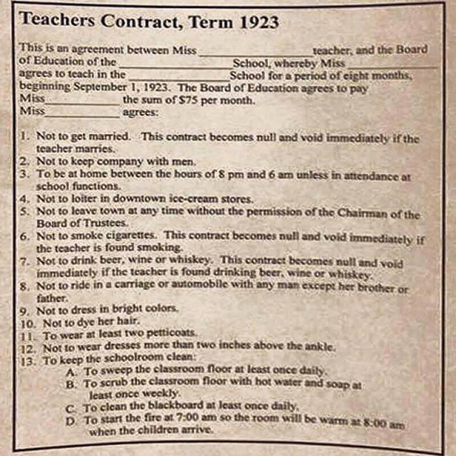 This sample female teacher’s contract from 1923 reminds us that, “We’ve come a long way, baby!” It stipulates some truly jaw-dropping rules. Women aren’t allowed to get married, keep company with men, leave town, ride in cars with boys (except their father or brother), drink, smoke or even leave their house between the hours of 8 P.M. and 6 A.M. And the most baffling rule is probably the one forbidding women from “loitering in downtown ice-cream stores.”