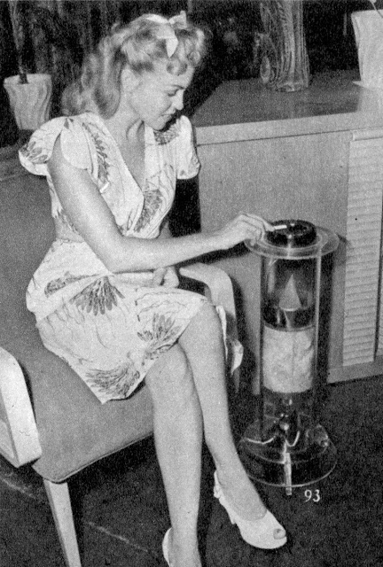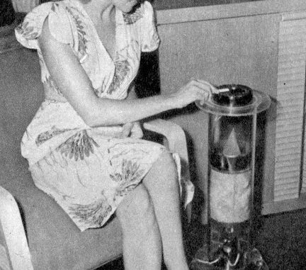 Ash Tray Breathes and inhales the smoke that usually drifts over into a non-smoker’s eye. It draws all smoke down into the stand and keeps the room free of fumes, too. Penny Martin, of Los Angeles, was shown using this new and welcome invention in 1947. It operates electrically, uses house current.