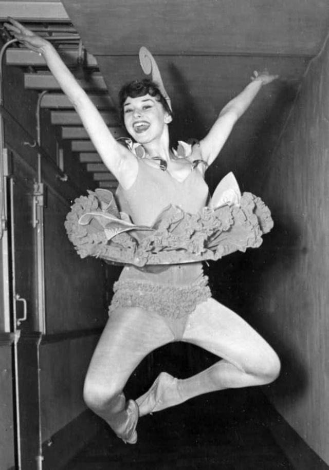 While Ella worked in menial jobs to support them, Hepburn appeared as a chorus girl in the West End musical theatre revues High Button Shoes (1948) at the London Hippodrome, and Cecil Landeau’s Sauce Tartare (1949) and Sauce Piquante (1950) at the Cambridge Theatre. During her theatrical work, she took elocution lessons with actor Felix Aylmer to develop her voice. After being spotted by a casting director while performing in Sauce Piquante, Hepburn was registered as a freelance actress with the Associated British Picture Corporation.