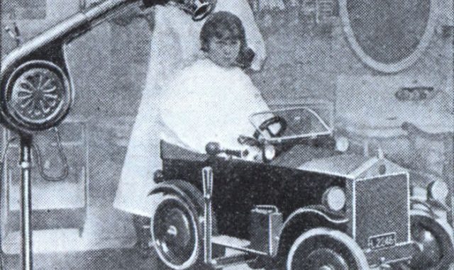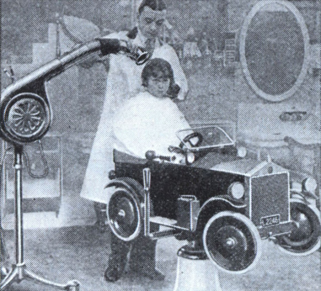 The novel automobile barber chair pictured below was the latest device for keeping children quiet while having their hair trimmed or dressed. This chair was introduced at the Hairdressing Fair of Fashion at White City in London in 1930. The model car was rather complete in equipment for the amusement of the child customer. The brake at the right side was used by the barber to lower or raise the chair.