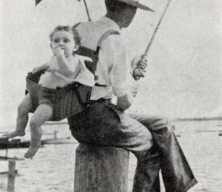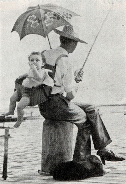 There was no use in staying home with the baby when his wife was away, a Miami man decided. So he rigged up a seat slung over his shoulders for the youngster, attached a sunshade, and now the baby goes along whenever daddy fishes.