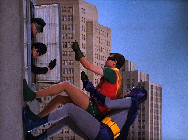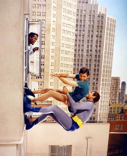Here is a compilation of all the cameo appearances of celebrities who happened to coincidentally look out the window just when Batman and Robin were climbing up or down a building. They then would proceed to have a bizarre conversation with the dynamic duo. This simple stunt was accomplished by having Adam West and Burt Ward walk on the floor hunched over while the camera was tilted on its side as the celebrity pops out of the floor disguised as a window.
