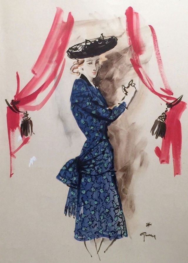 Cocktail suit and hat by Balenciaga, illustration by René Gruau, 1945