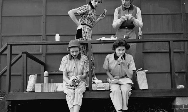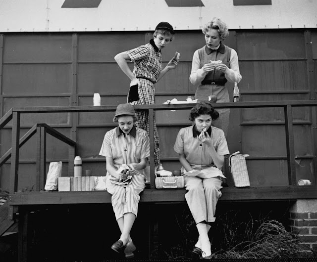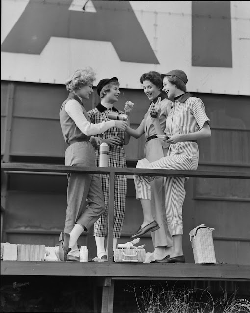 Enter noted designer Tina Leser, who debuted a fashion line that year for the burgeoning female lunchpail set. In a group of clothes called Fashion for Industry released in stores, Leser presented her solutions. The standard, safe—but usually shapeless—factory coverall appears in practical but neatly fitted and attractive versions… Some designs have pants legs narrowed so that they can be pushed up and hidden under a skirt on the way to work.