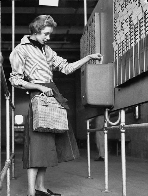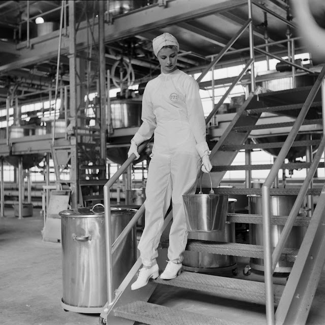 In April 1953 about 16 million Americans worked in manufacturing jobs—many more than today, where the number is about 11 million. And roughly a quarter of those workers back then were women. Many work near moving machinery or poisonous dusts and acids, and must wear coveralls, made for safety and comfort but seldom for style.