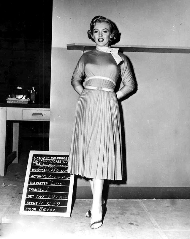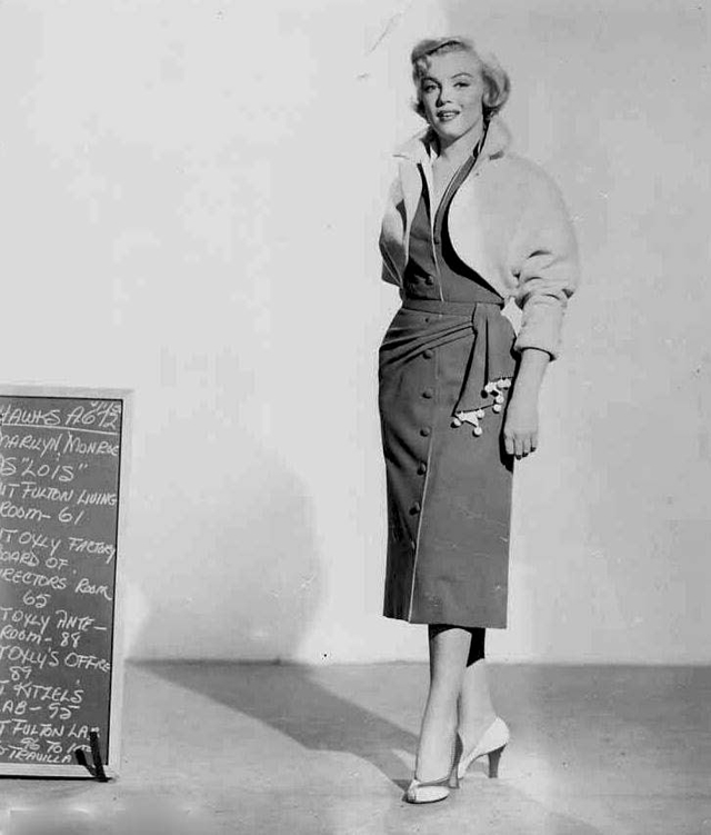 For Monkey Business (1952), Marilyn Monroe did several costume tests before filming began. In these tests, she is seen trying out different looks for her role as Miss Lois Laurel, the young, flirtatious secretary in Howard Hawks’ screwball comedy starring Cary Grant and Ginger Rogers. The wardrobe department explored a few variations of form-fitting outfits that matched the character’s youthful and seductive energy, often pairing them with Monroe’s signature platinum curls and bright lipstick.