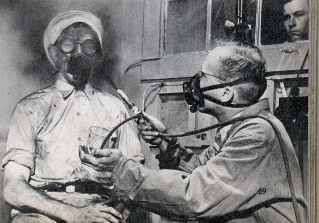 Black Spray of carbon was blown into the face of this industrial worker to test the efficiency of a respirator incorporating a revolutionary new dust filter, 1947. The mask was developed by the American Optical Company to protect laborers exposed to microscopic poisonous and disease-producing dusts smaller in diameter than 24 millionths of an inch.