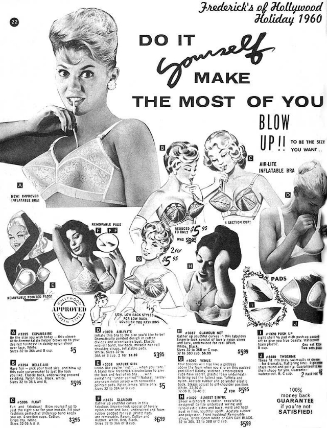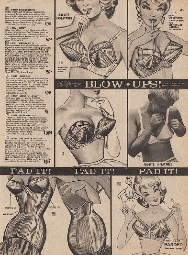 What was a woman to do if she wanted to boost her cleavage in the days before Wonderbra was on the market and the more drastic measure of plastic surgery wasn’t so readily available? The answer is by wearing an inflatable bra that the wearer could blow up to the size they desired themselves.