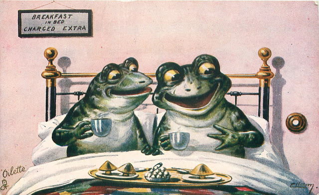 In 1907, Raphael Tuck and Sons published a series of postcards featuring animal couples having breakfast in bed. The happy looking animals are drinking tea and have foods they would presumably enjoy, such as a robin and mice for the cats, biscuits for the spaniels, porridge for the three bears and mushrooms for the frogs. Strangely the geese and chickens both have eggs on their trays.