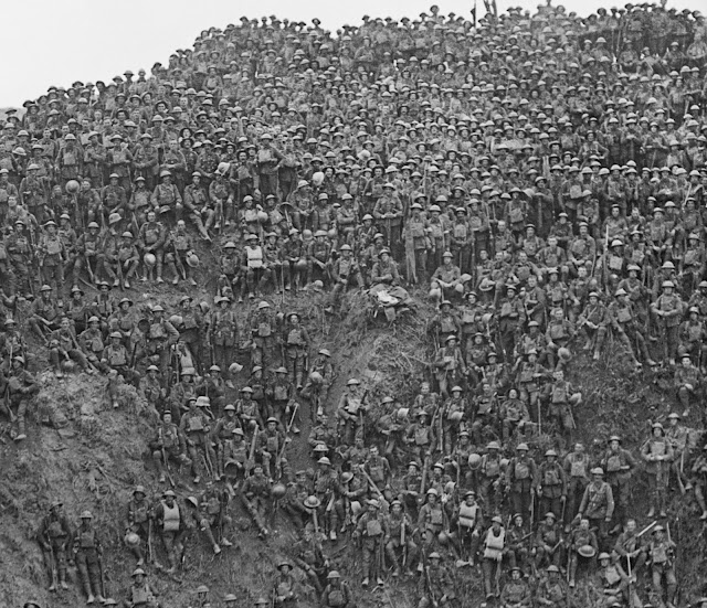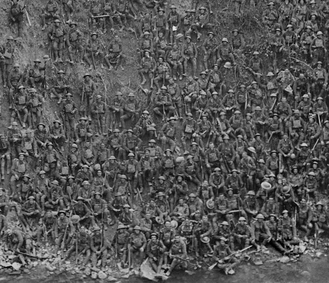 This famous photo shows Brigadier-General John Vaughan Campbell VC addressing men of the 137th Brigade (46th Division) on the Riqueval Bridge over the St. Quentin Canal in France on October 2, 1918, during the final months of World War I.