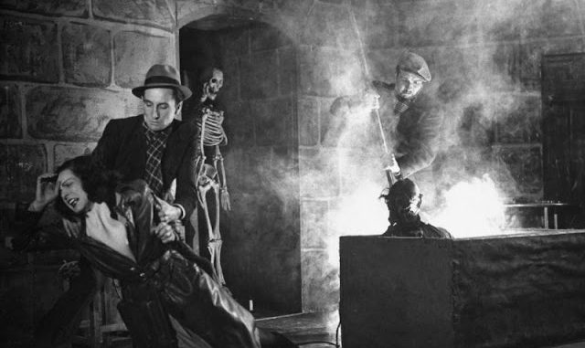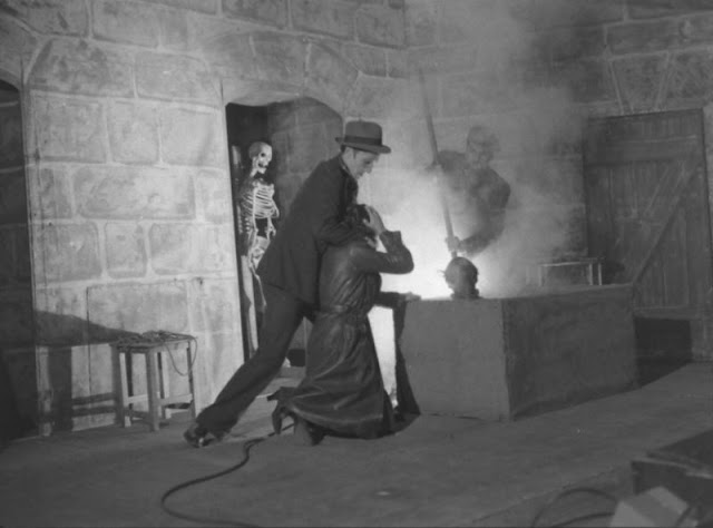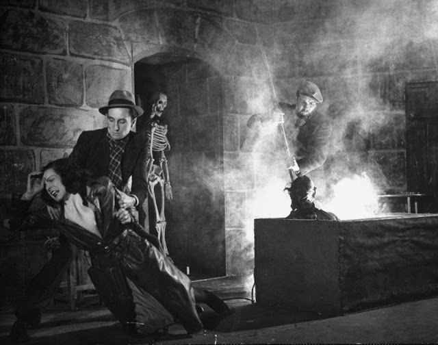 Actors demonstrating use of the acid vat to make skeletons in production trick at the Grand Guignol Theater.