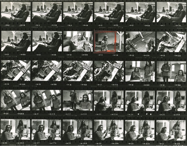 | One of dozens of proof sheets of black-and-white photographs taken by the band’s friend and resident photographer, Bob Seidemann. |