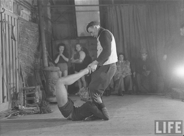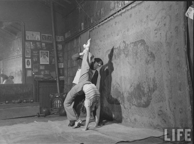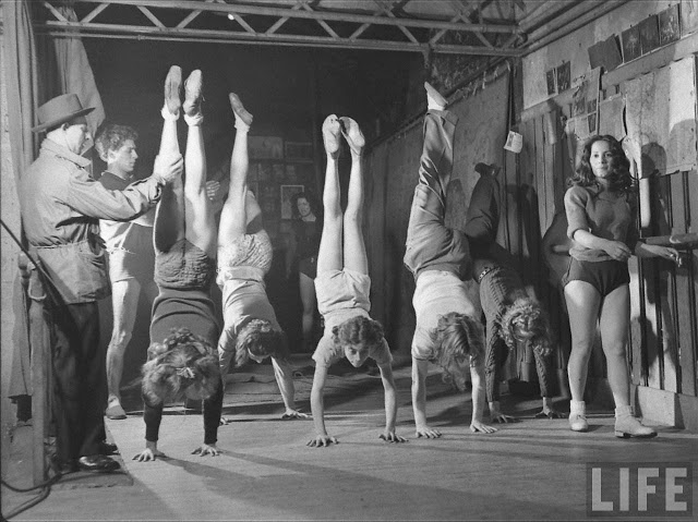 These fascinating pictures were taken by Hans Wild for LIFE magazine at a school for acrobats, Gymnase Saulnier, in Paris, 1947. According to Miss Moss, Le Père Saulnier was called the “girls breaker” because he was really strict with his students. You can see that the front door in the last picture is still in Paris, it’s in the 16 rue Véron.