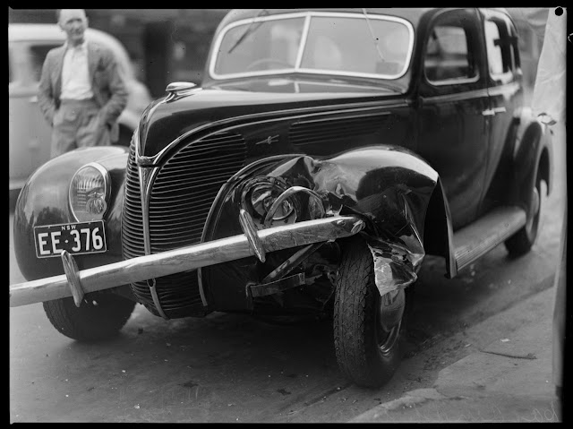 January 1, 1940, Westgate Service Station in Annandale, Sydney: 1938 Ford V8 hits parked 1935 Ford Model C (four cylinder), lifting it up onto footpath and into petrol pumps; it takes out one pump and ends up against another pump; fire was put out fairly quickly by fire trucks from two stations. There was no one in the Model C at the time and the V8 driver was charged with drink driving.
