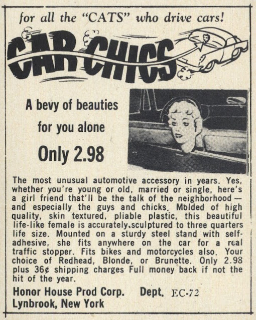 “The most unusual automotive accessory in years. Yes, whether you’re young or old, married or single, here’s a girl friend that’ll be the talk of the neighborhood — and especially the guys and chicks.
