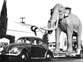 Sculptor Howard Ball Towing His Life-Size Mammoth to the La Brea Tar Pits Using Only His Volkswagen, 1967
