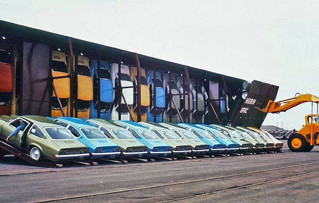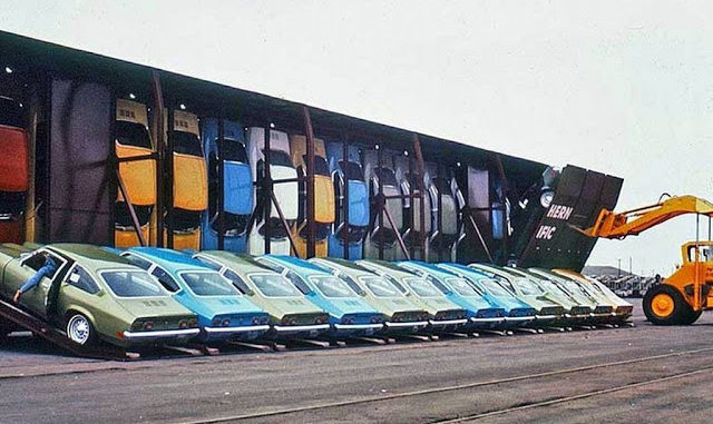 The engineers at GM and the Southern Pacific Railroad came up with a clever solution. Instead of loading the cars horizontally, the Vegas will be placed vertically on a specially designed auto-rack – the Vert-A-Pac. Within the same volume of an 89-foot car, the Vert-A-Pac could hold as many as 30 automobiles instead of 18.