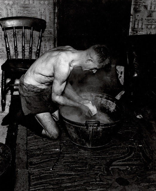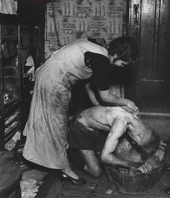 In 1930s England, miners typically bathed at home in a basin of hot water, often with a woman (wife or daughter) washing their coal-covered body as shown in Bill Brandt’s famous 1937 photograph, reflecting harsh conditions and community support. Some larger collieries also began building pithead baths with facilities like showers, but these were not widespread until the post-1947 National Coal Board era.