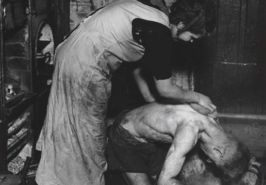 Bill Brandt’s 1937 photograph provides a striking and intimate glimpse into the life of a coal miner’s family in Chester-Le-Street, Durham. The image captures the miner, his skin darkened by coal dust and long hours underground, being carefully bathed by a young woman in a simple apron. The tender act of washing stands in stark contrast to the harshness of his daily labor, highlighting both the physical demands of mining and the emotional care necessary to sustain individuals in such a grueling occupation.