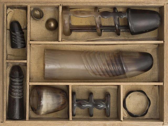 Here’s a set of woman’s ‘toilet’ implements for sexual gratification, consisting of six dildoes and penis supports, two rings (rin no wa, namako no wa) and metal ball (rin no tama). Made of horn, metal. In wooden storage box.