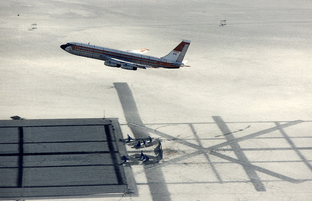 On the morning of December 1, 1984, the test aircraft took off from Edwards Air Force Base, California, made a left-hand departure and climbed to an altitude of 2,300 feet (700 m). The aircraft was remotely flown by NASA research pilot Fitzhugh Fulton from the NASA Dryden Remotely Controlled Vehicle Facility. All fuel tanks were filled with a total of 76,000 pounds (34,000 kg) of AMK and all engines ran from start-up to impact (flight time was 9 minutes) on the modified Jet-A. It then began a descent-to-landing along the roughly 3.8-degree glideslope to a specially prepared runway on the east side of Rogers Dry Lake, with the landing gear remaining retracted.