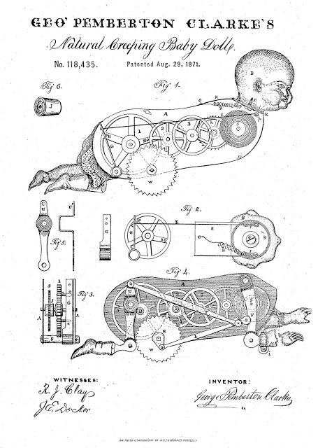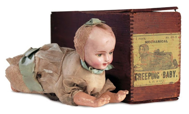 Now here’s certainly a creep, it’s actually called a “Creeping Baby Doll” which was first patented by Robert J. Clay on March 14, 1871. In the application, he describes his creepy baby as “a very amusing toy… produced at small cost.”