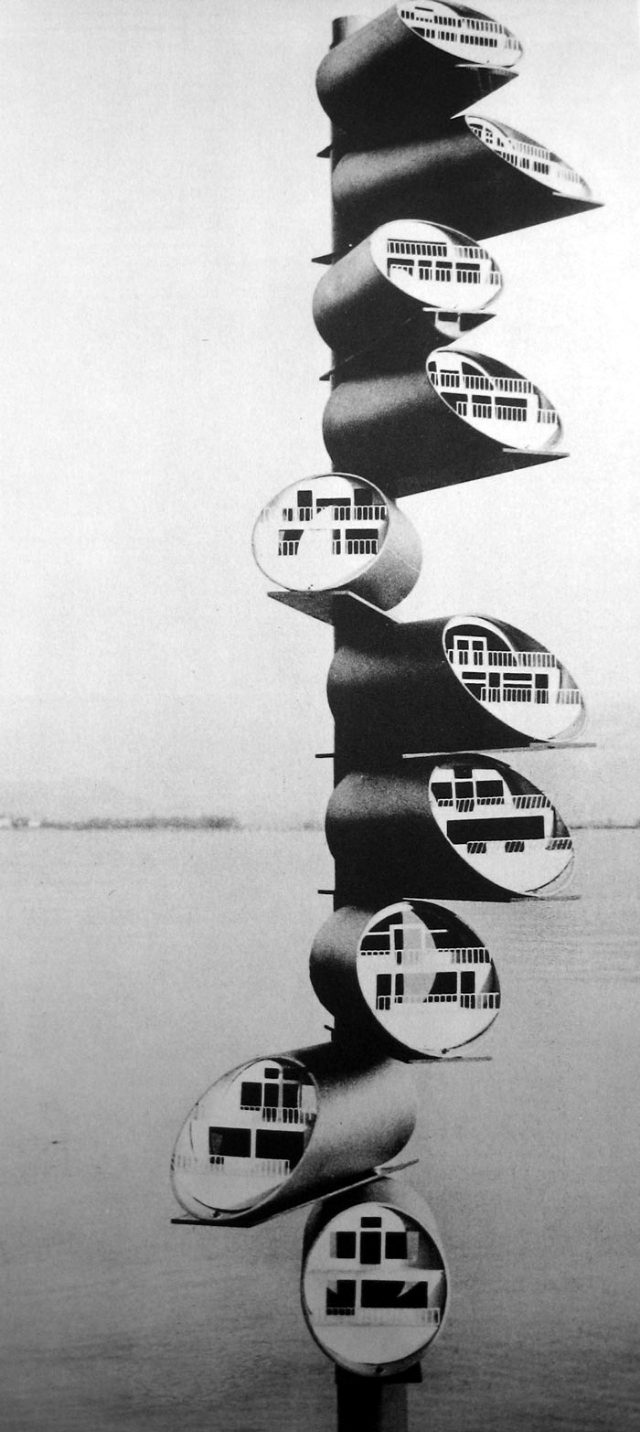 Dessauges spent most of the sixties compiling drawings and scale models of structures such as this—a playful, prefabricated “tube housing tower.” Sadly, none of these imaginings ever came to life, and by the end of the decade financial necessity forced Dessauges to turn his attention to more practical endeavors.