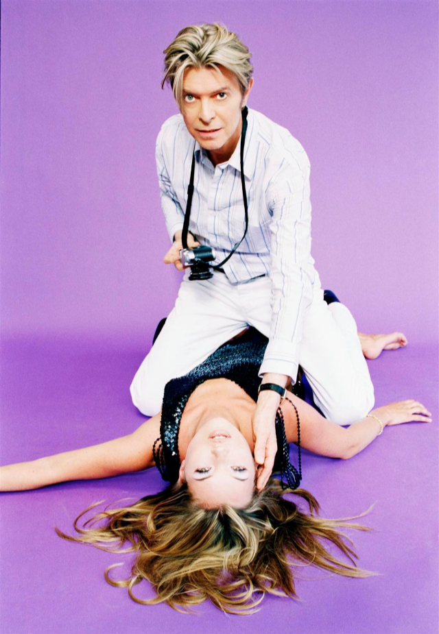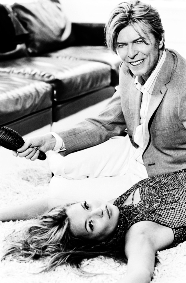 These photos are part of an iconic series the famous contemporary photographer Ellen von Unwerth created in 2003 for Q Magazine. The photographs were commissioned for the October 2003 cover and inside pages of the British music magazine. The shoot combines two legends, Kate Moss and David Bowie, who shaped the Western pop culture of the late 20th century. It was notable as the pair had not met before. The session occurred in New York City in a setting featuring midcentury modern furniture, including a couch and a fluffy carpet.