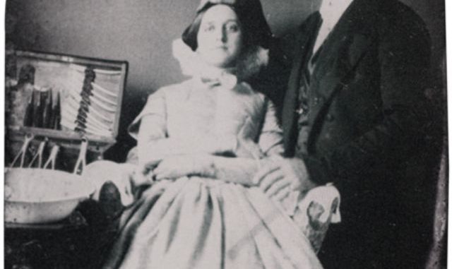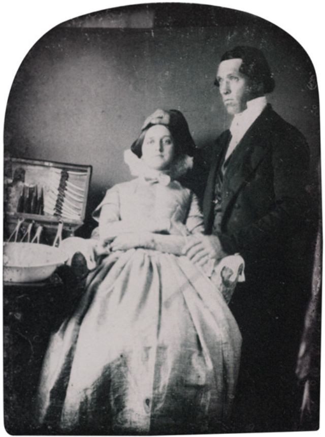 This daguerreotype is highly unusual for its era, in that the patient is female. Most likely she is the dentist’s or photographer’s wife. By including a woman, calmly sitting in the dental chair, the dentist conveys a mannered, non-frightening image of ‘painless dentistry. (via Historical Indulgences)