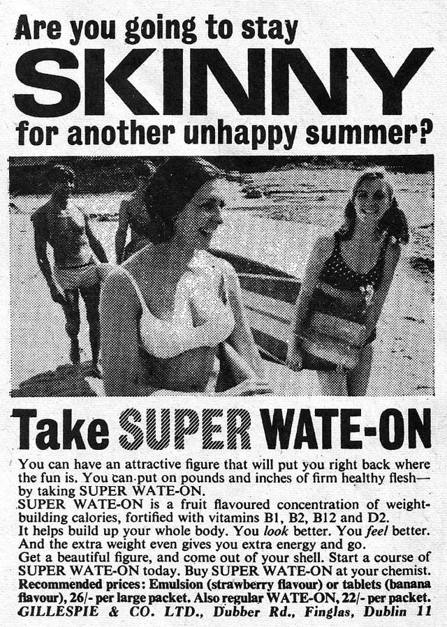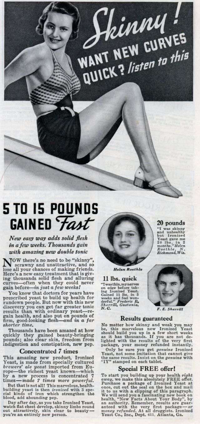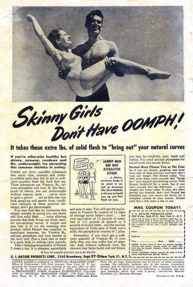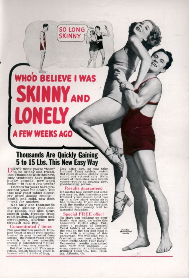 Perusing women’s magazines from the fifties to the seventies, it is not at all difficult to find plenty of products made to help women gain weight. “Don’t be SKINNY! Amazing new easy way can quickly put pounds and inches of firm, solid flesh on thin folks…” Take a look through these vintage weight gain ads for women below: