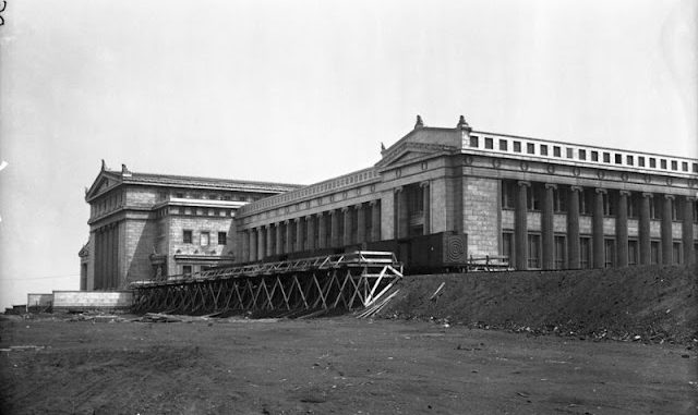 Corner of new Field Museum building showing railroad car with spiral at end, train tracks used in move from Field Columbian Museum, 1920