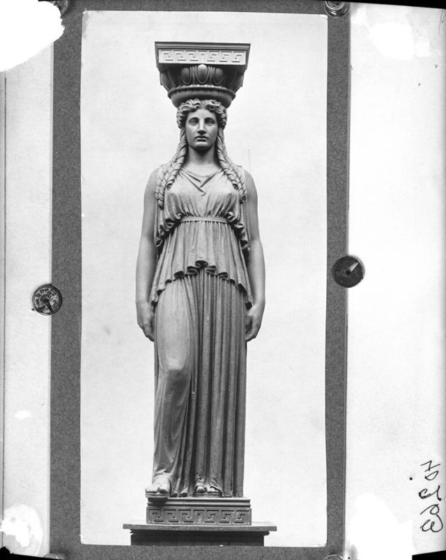 Female Caryatid statue with her right knee bent (sculptor was Henry Hering) shown prior to installation on Field Museum Exterior of building, 1919