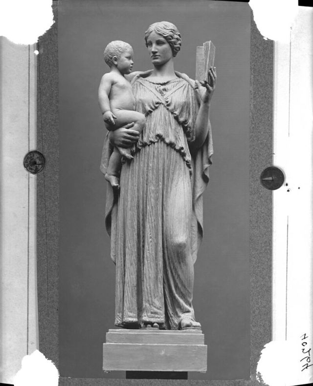 Statue representing Knowledge by Henry Hering, female figure holding baby, for Northeast corner of Stanley Field Hall, 1919